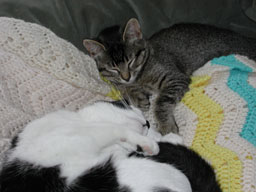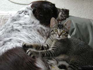 Everyone who has cats or dogs thinks theirs is special. Zoe is. You see, the day after she came home with us she became deathly ill with Feline Infectious Enteritis. I chose Zoe because Pi was killed in the street two weeks earlier. That this sweet little creature would die was too cruel and unfair. The Vet sent me home with meds and instructions, I pushed fluids every hour for three days and she recovered. When she went back to the vet for her checkup he told me he thought she had no chance and that he didn't recommend IC because so few survive at that age. He smiled broadly and quipped she "wasn't bad for a dead cat". Nope, not bad at all. |